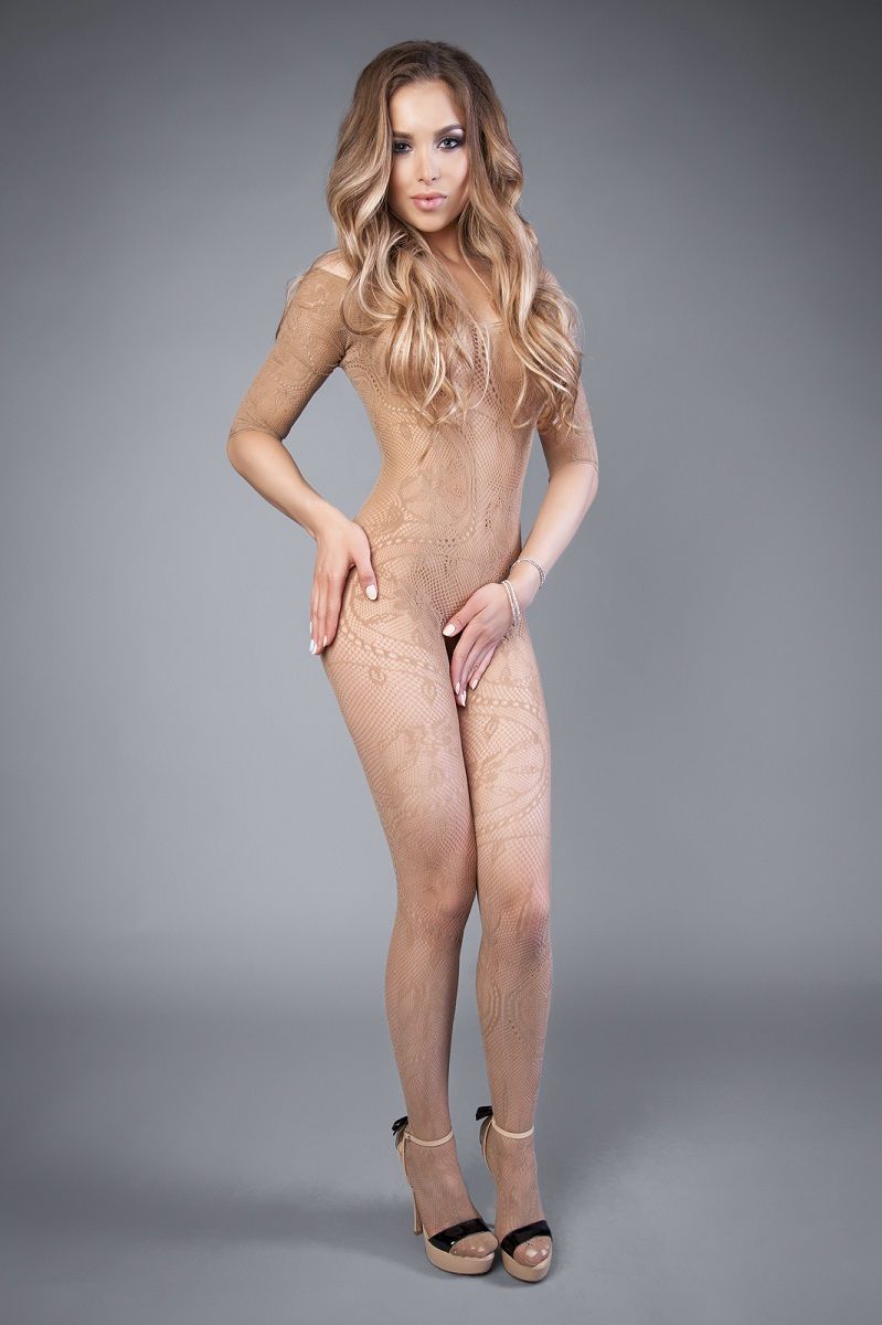 Бежевый комбинезон с замысловатым узором и короткими рукавами. С интимным доступом.