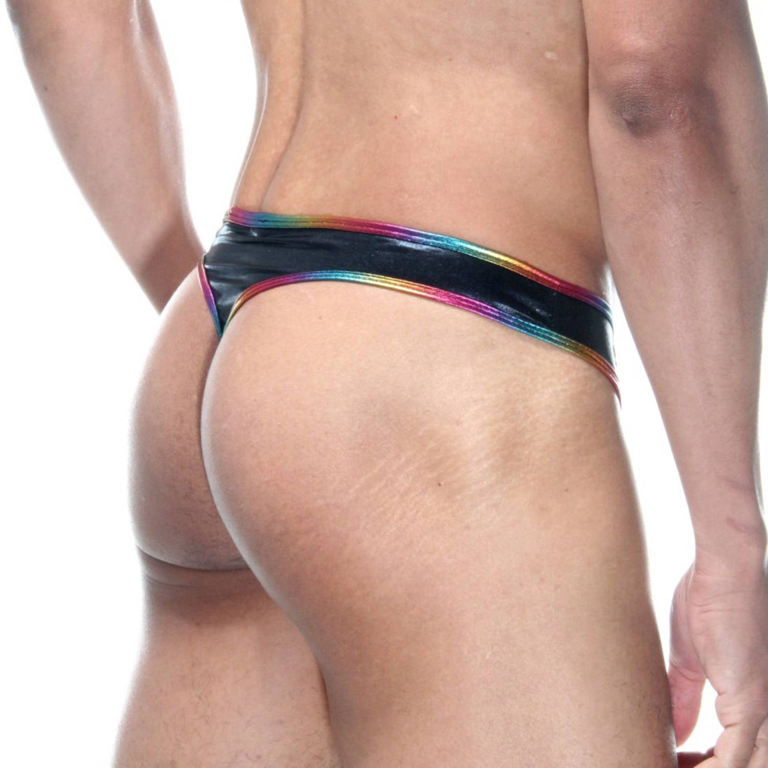 Черные трусы-тонги с блестящей радужной отделкой.