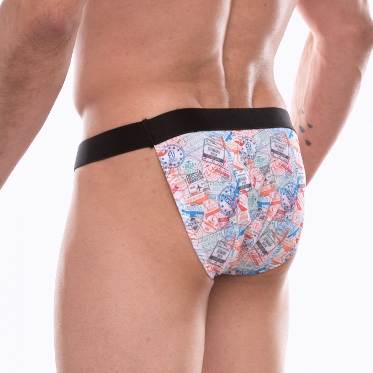 Мужские трусы-танга с принтом в виде цветных штампов.