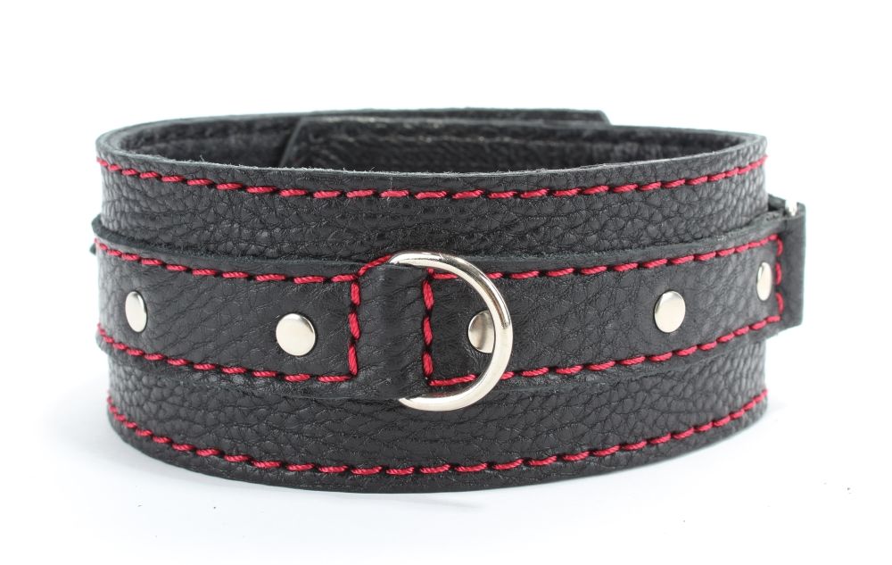 Черный кожаный ошейник с красной оторочкой. Декорирован небольшими заклепками в передней части изделия. Имеет D-кольцо для карабина. Имеет 7 отверстий для регулировки размера. Ширина - 5,4 см.