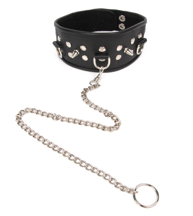 Ошейник-поводок с шипами и цепочкой из металла, украшенный шипами.