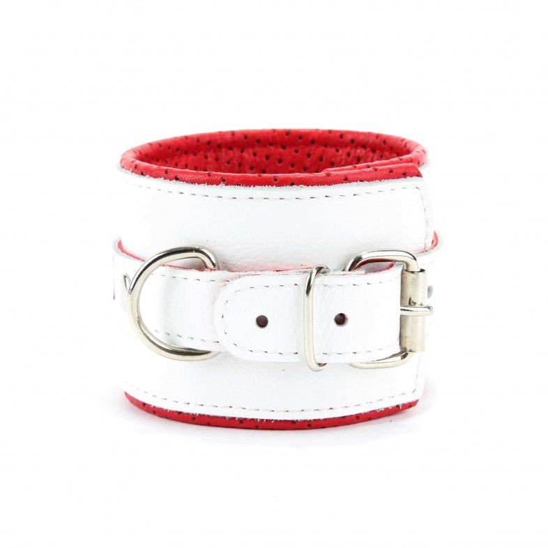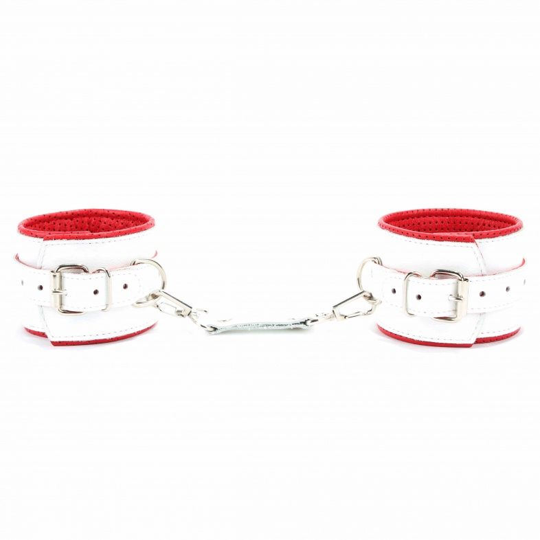 Наручники из натуральной кожи на пряжке, декорированы для образа медсестры. Выполнены из белой гладкой кожи с ярко-красным крестиком, подклад из нежной кожи с перфорацией. Ширина - 6 см.